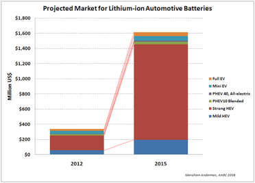 From the website, GreenCarCongress.com, an article titled, “Total Lithium-Ion Battery Sales Forecast To Double By 2012 to US$13.1B” (28 November 2008):