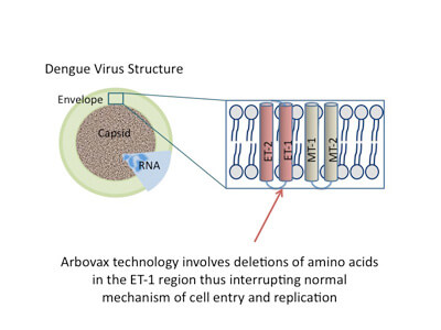 This strategy is the basis for the development of vaccines against insect-vectored, membrane-containing viruses like Dengue Fever. Introducing an attenuated virus deficient in infectivity gives the host immune system the chance to mount a defense before the onset of clinical symptoms. This will stimulate an immune response with a high concentration of neutralizing antibody to provide protection against the wild-type virus, without causing disease. In principle, this technology can produce a live-virus vaccine against any arthropod-vectored disease.